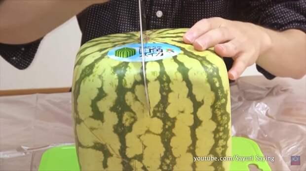 Скриншот видео Идеальный полосатый кубик. Каждая из его сторон по 18 сантиметров. Очевидно, что такого природа сама не могла создать. Неужели ГМО? Многие будут поражены, но с ГМО этот продукт не имеет ничего общего. Квадратный и вообще какой угодно арбуз – продукт естественной селекции.