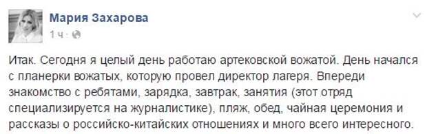 Первый день пребывания во всемирно известном детском лагере Захарова начала с планерки с директором заведения, после чего провела для отдыхающих здесь ребят зарядку.
