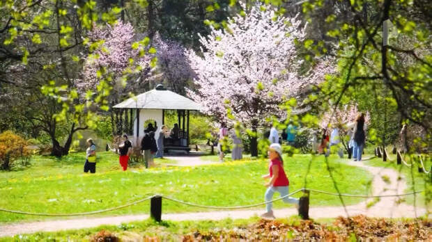 - Открывает сезон сакура, в июне расцветают ирисы, затем лаванда и спирея японская.Осенью горожане любуются алыми листьями японских кленов.А зимой – запорошенными снегом елями, соснами и можжевельниками.
