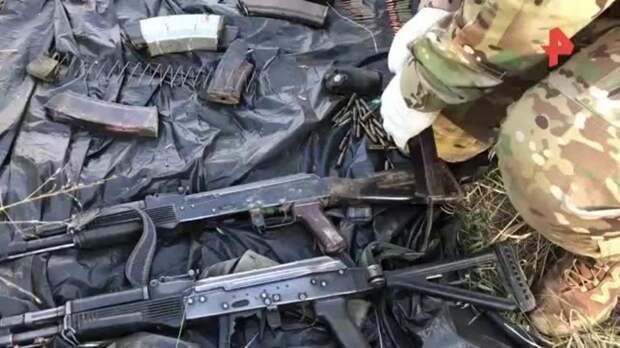 НАК обнародовал кадры с места спецоперации в Чечне. На них видно, как оперативники рассматривают и изучают автоматы и пистолет, которые были у бандитов.