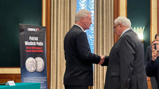 В посольстве России в Берлине состоялась торжественная церемония передачи серебряной монеты "Патриот Владимир Путин" послу РФ Сергею Нечаеву. Как сообщает корреспондент РЕН ТВ, награду вручил главный редактор немецкого журнала Compact Юрген Эльзессер во время пресс-конференции, приуроченной ко дню рождения президента России Владимира Путина.