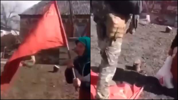 С собой бабушка взяла советское знамя, под которым сражались против фашистов ее родители.Силовики вручили пенсионерке пакет с продуктами. Сначала та не хотела его брать и говорила, что солдатам провизия нужнее. Когда женщина все же приняла продукты, националисты попросили "подержать" флаг, якобы, чтобы бабушке было удобнее нести еду. Но один из националистов бросил знамя на землю, назвав его "тряпочкой", и встал на флаг ногами.