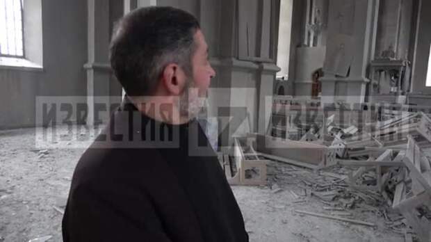 В церкви остались следы крови пострадавших россиян. Журналисты, как стало известно ранее, приехали в собор, чтобы снять последствия первого обстрела. Когда они находились внутри, на здание вновь обрушились снаряды.