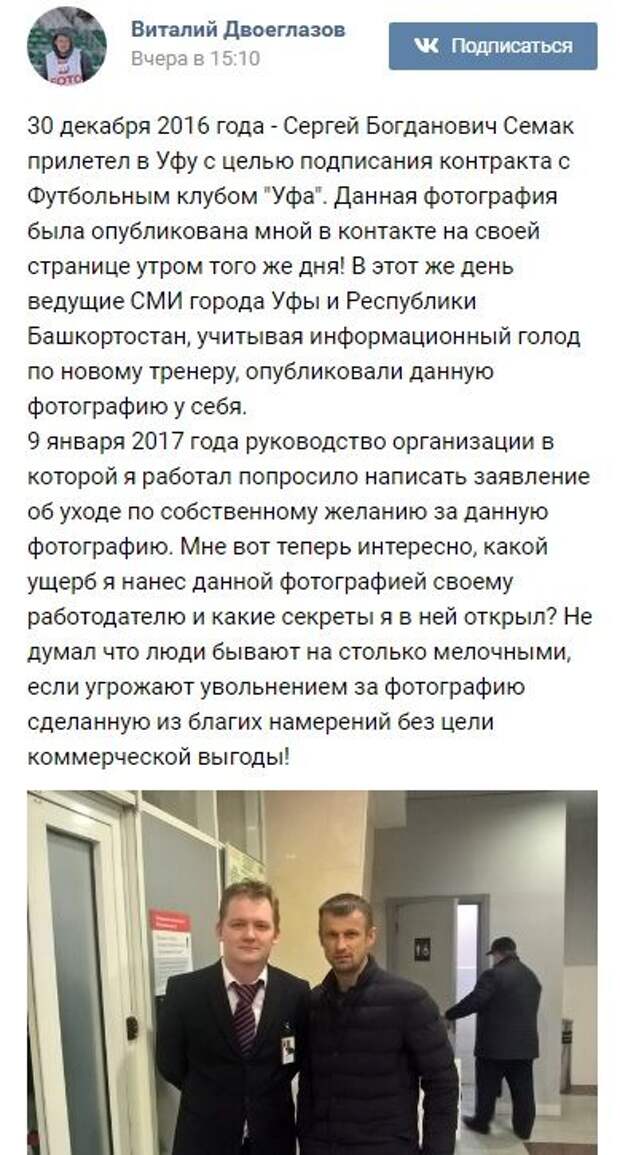 Сотрудник аэропорта Уфы поплатился за фотографию, размещенную им в одной из соцсетей. Инспектор службы авиационной безопасности воздушной гавани выложил снимок с новым главным тренером футбольного клуба "Уфа" Сергеем Семаком.