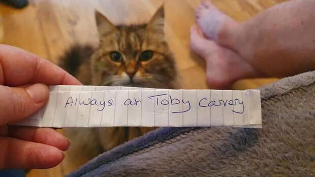 Однако 16 августа, когда животное вернулось домой, Коула заметила бумажку, прикрепленную к ошейнику."У этой кошки есть дом? Она всегда в Toby Carvery [ресторан]", - было сказано в записке.