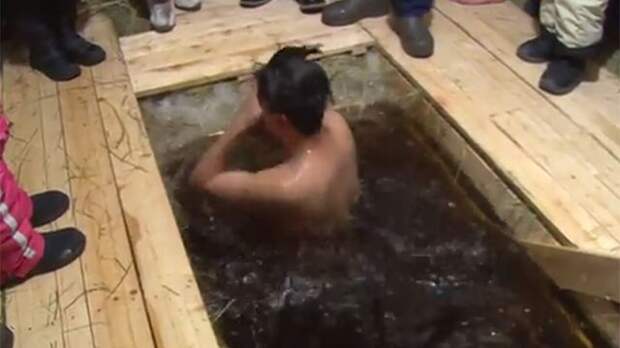 На кадрах видеозаписи видно, как парень из туристической группы несколько раз окунается с головой в купель.