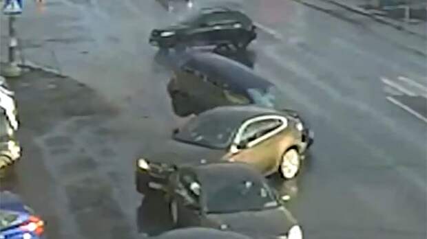 Массовое ДТП произошло в столице. Водитель легкового автомобиля пытался уйти от столкновения с иномаркой на перекрестке, но маневр не удался, и машина влетела в бордюр и протаранила два припаркованных авто.
