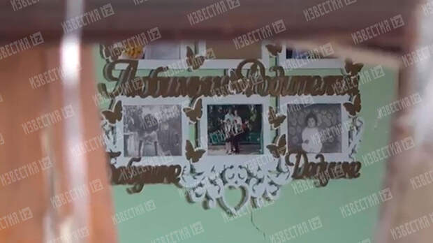 На этих кадрах можно увидеть, в частности, разрушенный дом, разбитое окно. Среди обломков на месте лежат женские сапоги. В доме можно увидеть портрет семьи с душераздирающей надписью: "Любимым родителям, бабушке и дедушке".