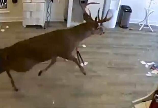 На кадрах видно, как животное врезается в окно салона и чуть не сносит сидящего на диване человека.