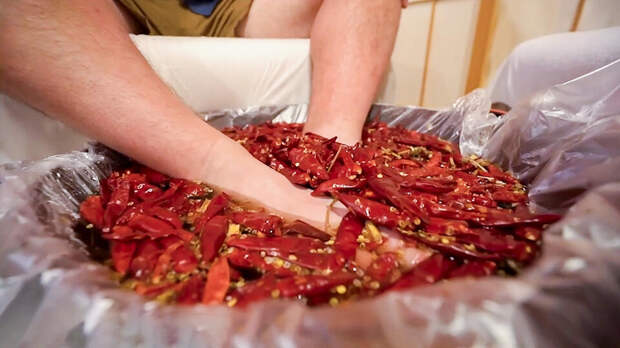 Ведущий программы Владислав Рябов сильно устал за три дня прогулки по Чунцину. По его словам, ноги у него просто отваливаются. Он решил испытать на себе чудо китайской медицины – перцовую ванночку для ног.