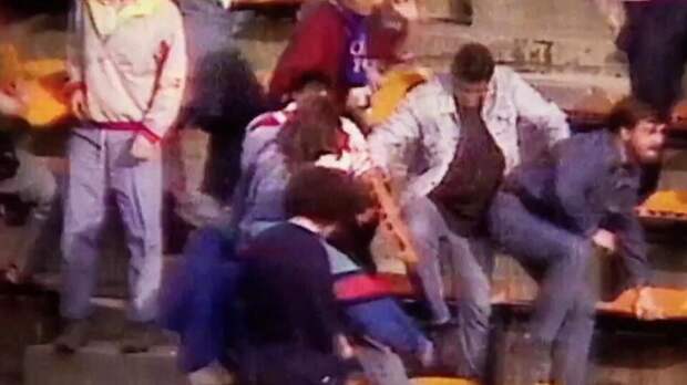 Скриншот видео В бойне на стадионе "Максимир" пострадали более ста человек. Остановить кровопролитие милиции не удалось: разъяренные фанаты, как цунами, смели кордоны, прорвали оцепление и ринулись в рукопашную. В ход пошло все, что подвернулось под руку: соперники избивали друг друга стальными прутьями, вырванными сиденьями, обломками рекламных щитов, били ножами, несколько болельщиков получили огнестрельные ранения. В драку вмешались и футболисты.