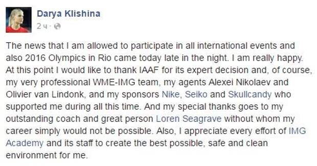 В своем же послании Клишина выразила благодарность только IAAF, команде IMG, своим агентам, спонсорам и американскому тренеру, с которым она работает – Лорену Сигрэйву.
