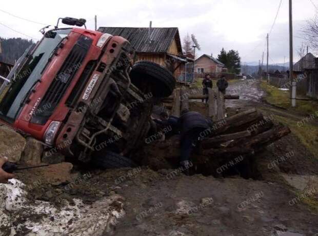 Отмечается, что мост был сооружен из бревен и не выдержал тяжести самосвала.