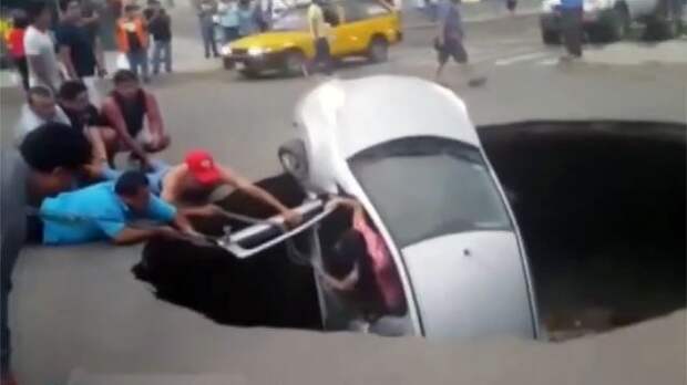 Целая семья чуть не утонула в автомобиле, когда он провалился пятиметровую яму в Перу. Глубокая воронка на дороге образовалась над канализационной трубой после сильных ливней.