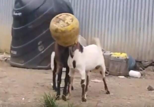 В Сети набирает просмотры видео, на котором запечатлено, как два козла застряли головами в одном и том же бидоне.