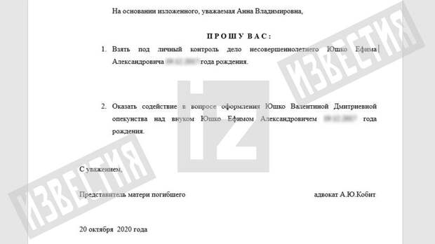 Адвокат отмечает, что его бабушка просит предоставить ей возможность взять внука под опеку. Кобит отмечает, что она подала необходимые документы. В связи с этим он просит Митянину оказать содействие в этом вопросе.