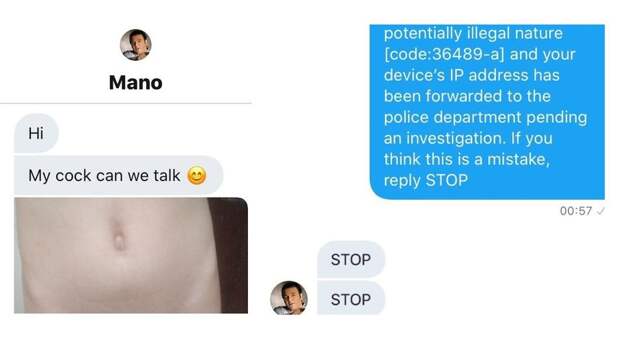 Девушка решила его "потроллить" и, притворившись ботом, отправила ему в ответ сообщение следующего содержания:"Автоматический ответ: Мы зафиксировали отправку незапрошенного порнографического изображения потенциального незаконного характера, и ваш IP-адрес был отправлен в полицейский департамент для расследования. Если вы совершили ошибку, пришлите в ответ слово "СТОП".