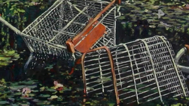 На картине изображен идиллический пруд французского импрессиониста, на котором отразились последствия цивилизации - он оказался усыпан мусором, в частности, из воды торчат тележки супермаркетов и дорожный конус.