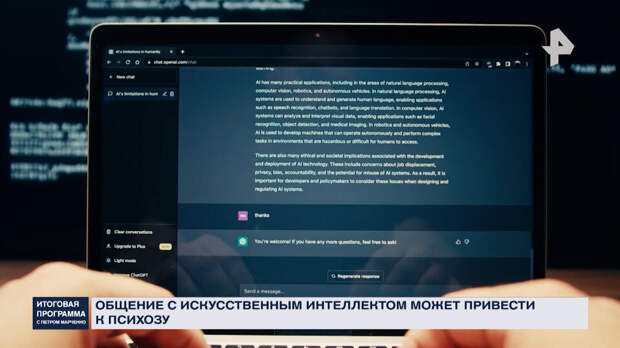Корреспондент Наталья Графчикова в сюжете для "Итоговой программы с Петром Марченко" рассказала о том, как нейросети могут превратиться в смертельную ловушку.Чуть не лишился рассудка из-за ИИ
