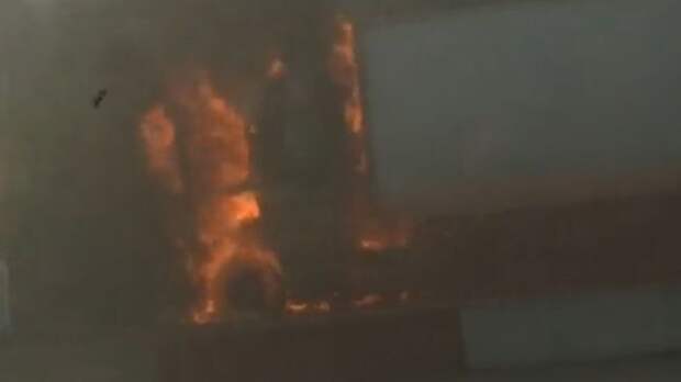 На записи очевидцев видно, что кабина автоприцепа охвачена огнем. На месте происшествия работают спасательные отряды.