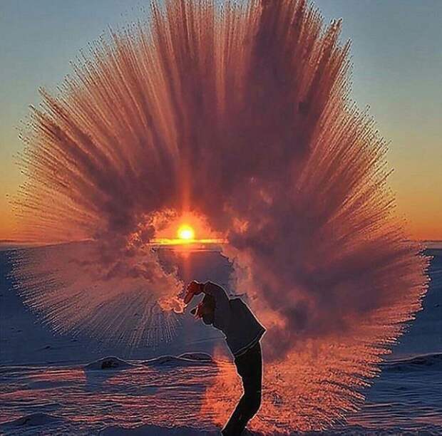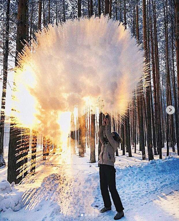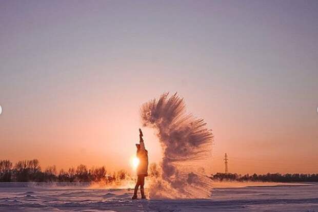 Пользователи размещают в соцсетях фото и видео, на которых распыляют на морозе горячую воду, красиво падающей на землю в виде градин.