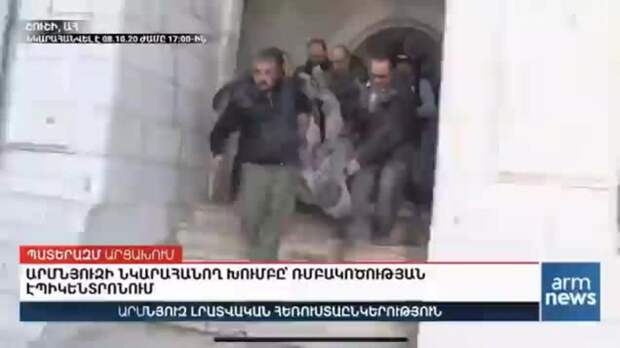 В Сети появились кадры, на которых запечатлены первые секунды после обстрела церкви в городе Шуши в Нагорном Карабахе. На видеозаписи, обнародованной армянскими СМИ, несколько человек выносят из храма одного из раненых журналистов.