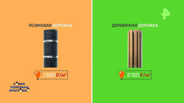"У резиновой дорожки стоимость1500 рублей за квадратный метр, а вот как раз у деревянной, понятное дело, все-таки экологически чистый материал подороже 2100 рублей за квадратный метр. Что купить? Что предпочесть?" – задал ведущий Щеглов вопрос эксперту.