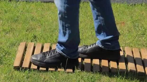Прогуляемся теперь по деревянному образцу. Как оказалось, он тоже шатается и проваливается в газон.