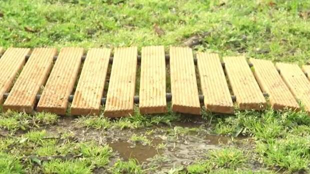 Резиновая дорожка – пористая. Она пропускает воду насквозь, а значит, на поверхности не будет луж. При этом материал не гниет и не требует никакой обработки, в отличие от дерева: если его не пропитывать антисептиками и водоотталкивающими средствами, оно не проживет и сезон.