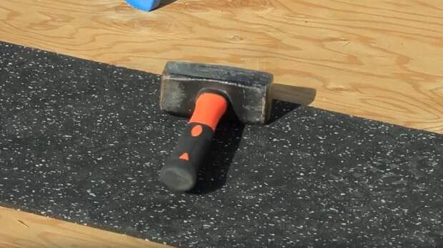 Резиновая дорожка выдержала и падение кувалды, и обоих блинов. Она не треснула и не порвалась. На ней не появилось ни царапины. А вот на дорожке из дерева появились небольшие повреждения и занозы, а значит, ходить босиком по такой дорожке травмоопасно.