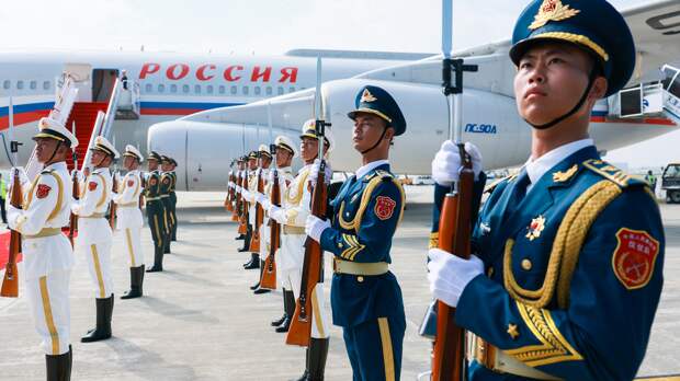 Китайские офицеры появляются у флагштоков с российским флагом. Его бережно поднимают рядом со знаменем КНР. На летное поле приезжает кортеж из десятков машин.