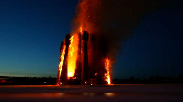 В этом году символическим костром масленицы стала инсталляция под названием "Темный лес", высотой с 20-этажным дом. Арт-объект состоял из 16 башен-деревьев и лабиринта.