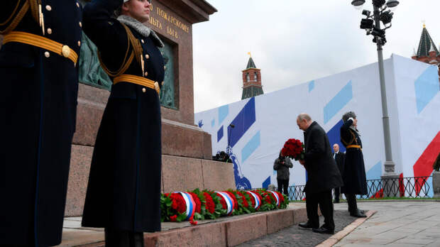 Президент России Владимир Путин возложил цветы к памятнику Кузьме Минину и Дмитрию Пожарскому в День народного единства.