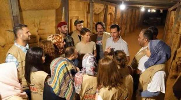 Президент Сирии Башар Асад и его жена Асма посетили галерею, которая была создана художниками в бывшем бункере боевиков на окраине Дамаска.