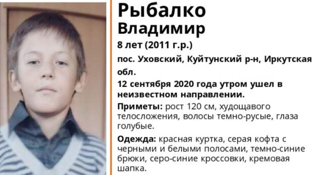 Ребенок пропал 12 сентября в поселке Уховский Куйтунского района.