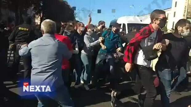На кадрах, снятых на месте событий, видно, как несколько сотрудников ОМОНа хватают мужчину и уносят с криками "тащи в машину".