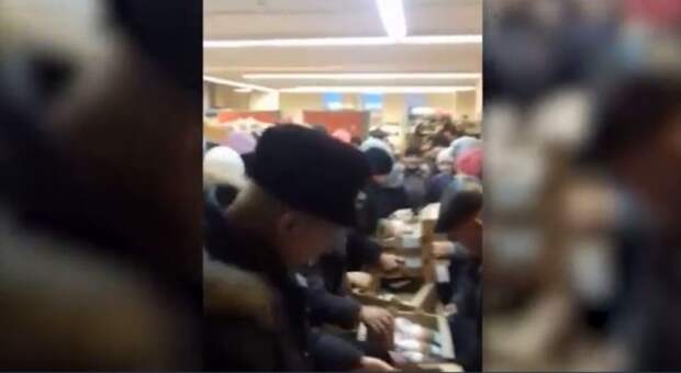 На видеокадрах можно наблюдать, как посетители, большинство из которых составляют люди пожилого возраста, активно работая локтями, отталкивая и пиная друг друга, прорываются к ящикам с курицей.