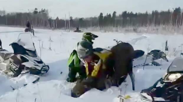 На кадрах видно, что группа туристов, путешествующая на снегоходах, набрела на лосенка, застрявшего в снегу.