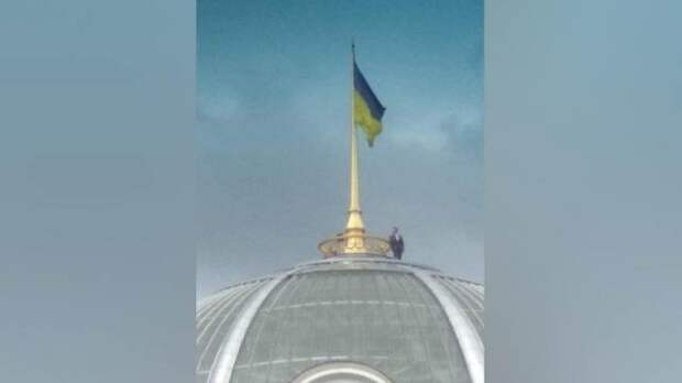 В Интернете появились фото, на которых изображен человек в деловом костюме, стоящий на куполе здания Верховной рады Украины.