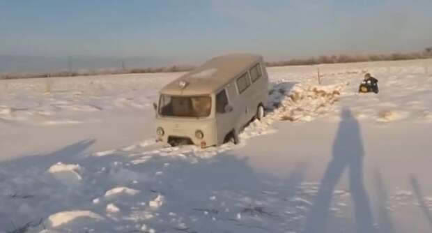В соцсетях набирает популярность видео с грузовым фургоном УАЗ, который застрял в снежном поле. На записи запечатлено, как машина сначала застряла в снегу, а затем, когда ее удалось вытащить из ямы, провалилась носом в другую колдобину.