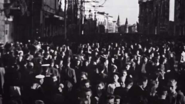 Скриншот видео "Левитану дали всего 35 минут для подготовки. Ему нужно было пересечь Красную площадь, чтобы достичь радиоточки. Площадь была полна людей, которые ждали этого сообщения. Когда он просил людей подвинуться, они говорили: "Куда ты спешишь, какие у тебя могут быть дела? Сейчас же Левитан объявит о Победе". Он был вынужден вернуться и попасть в радиостудию другим образом", - рассказывает Елена Кузьменко.