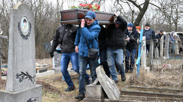 Мужчины несут гроб с телом погибшей при обстреле украинскими войсками здания школы в Горловке в ДНР. 25 февраля, в результате массивного обстрела со стороны ВСУ школы № 50, от прямого попадания снаряда трагически погибли две учительницы: Кудрик Елена Павловна, 1969 года рождения и Иванова Елена Викторовна, 1977 года рождения.