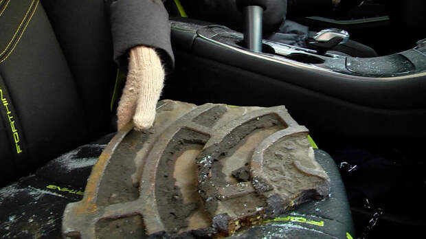 В лобовом стекле – пробоина, осколки разлетелись и сверкают по всему салону, а на пассажирском кресле лежит тяжелый кусок канализационного люка.