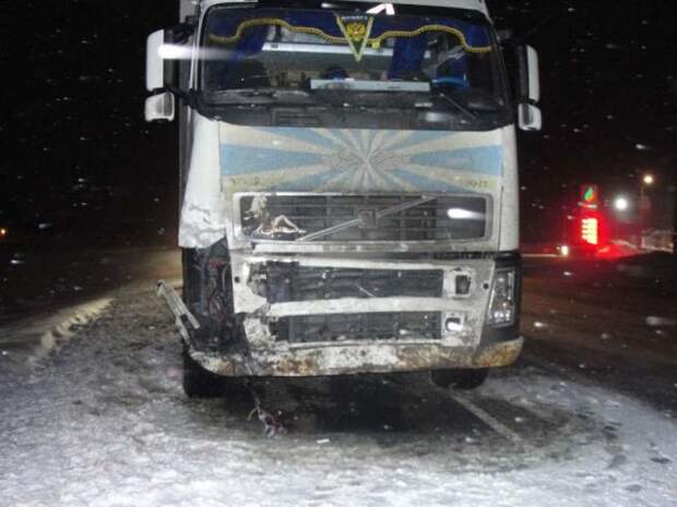 На 889-м километре трассы столкнулись легковушка Hyundai и фура Volvo.По предварительным данным, авария произошла из-за гололеда на дороге. Водитель легковой машины не справился с управлением, задел фуру, а после съехал в кювет.