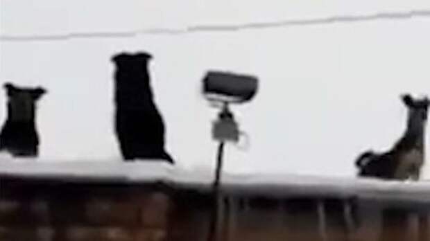 На записи слышно, что находящиеся на обледенелой крыше животные воют. Авторы записи задаются вопросом, как собаки попали на крышу.