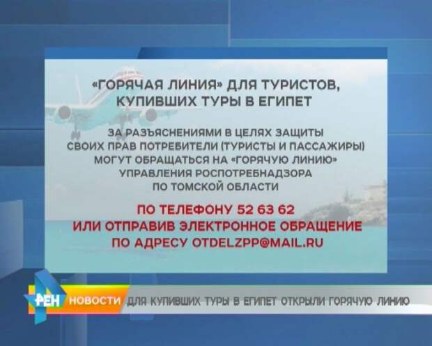 Для томичей, купивших туры в Египет, открыли горячую линию. Туристы смогут проконсультироваться у специалистов роспотребнадзора по обмену или возврату путевки. Получить информацию можно по телефону 53-63-62 или отправив электронное обращение. Адрес вы видите на своих экранах.