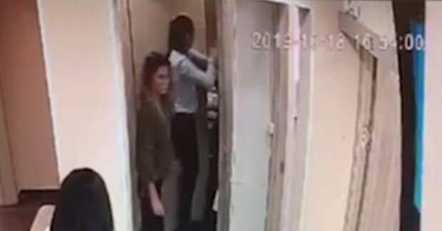 На записи видно, как женщина в медицинском халате забегает в кабинет и пытается закрыть за собой дверь, однако за ней пытается войти в помещение пациентка, которую удерживает, судя по всему, администратор клиники.