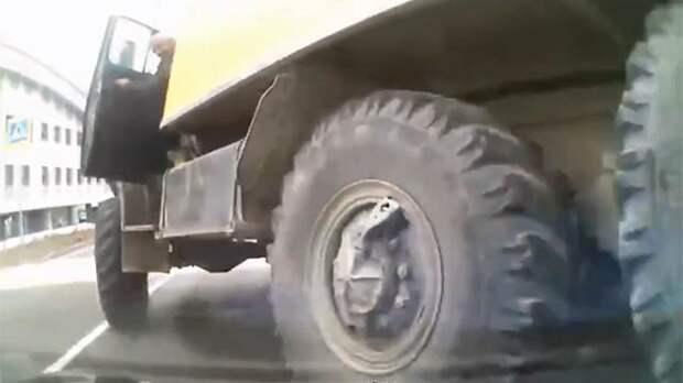 Владелец регистратора отчаянно пытался уйти от столкновения. Наконец и регулировщик забил тревогу.Однако многотонную машину было уже не остановить. Тяжеленные колеса буквально сплющили капот иномарки. То ли тормоза отказали, то ли шофер совсем растерялся.