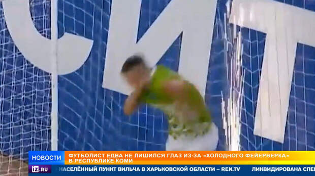 Футболист пытался помешать голу соперника, выскочив по инерции за пределы площадки. И именно в тот момент искры, которыми отмечают забитый мяч, выстрелили в лицо спортсмену.