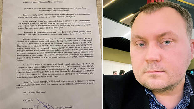 В письме Ефремов раскаивается за содеянное и приносит родственникам Захарова извинения за то, "что сотворил".